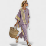 Entdecke das Faith Set, eine perfekte Fusion aus natürlicher Frische und mediterräner Ästhetik. Dieses Set, gefertigt aus leichtem Material, präsentiert ein elegantes Design mit vertikalen Streifen, die einen handwerklichen Touch verleihen und die Figur stilisieren. Mit einem oversize Schnitt, der Leichtigkeit und Komfort garantiert, bewegen sich das asymmetrische Top und die weit geschnittenen Hosen fließend und bieten einen bequemen Look voller Charakter. Ideal für warmes Wetter und empfindliche Haut, ist der Bambusleinenstoff perfekt, um den Sommer zu genießen. Dieses zeitlose Set ist die perfekte Wahl für Küsten-Spaziergänge, entspannte Ausflüge oder tägliche Looks mit einem bohemian Flair. Lass jeden Tag mit dem Daisy-Set besonders werden!